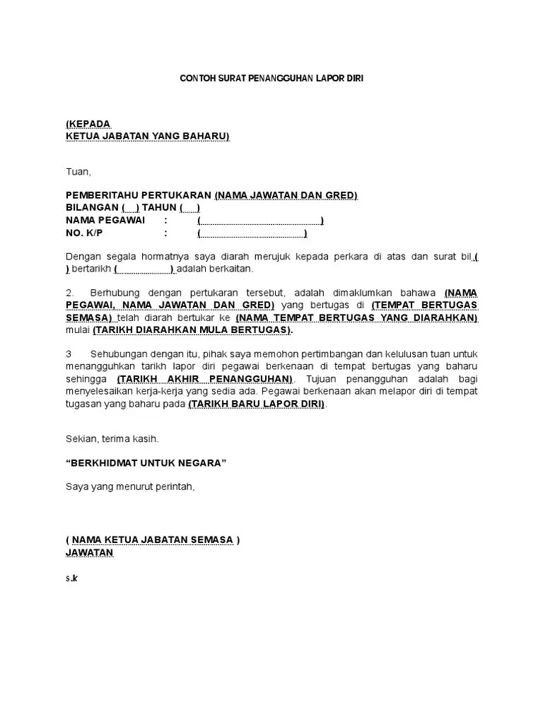 Salinan surat kebenaran ketua jabatan (jika ada penangguhan lapor diri untuk pemangkuan) surat penangguhan lapor diri. 7/18/2019 contoh surat penangguhan lapor diri 1/3contoh surat penangguhan lapor diri(kepadaketua jabatan yang baharu)tuan,pemberitahu pertukaran (nama .
